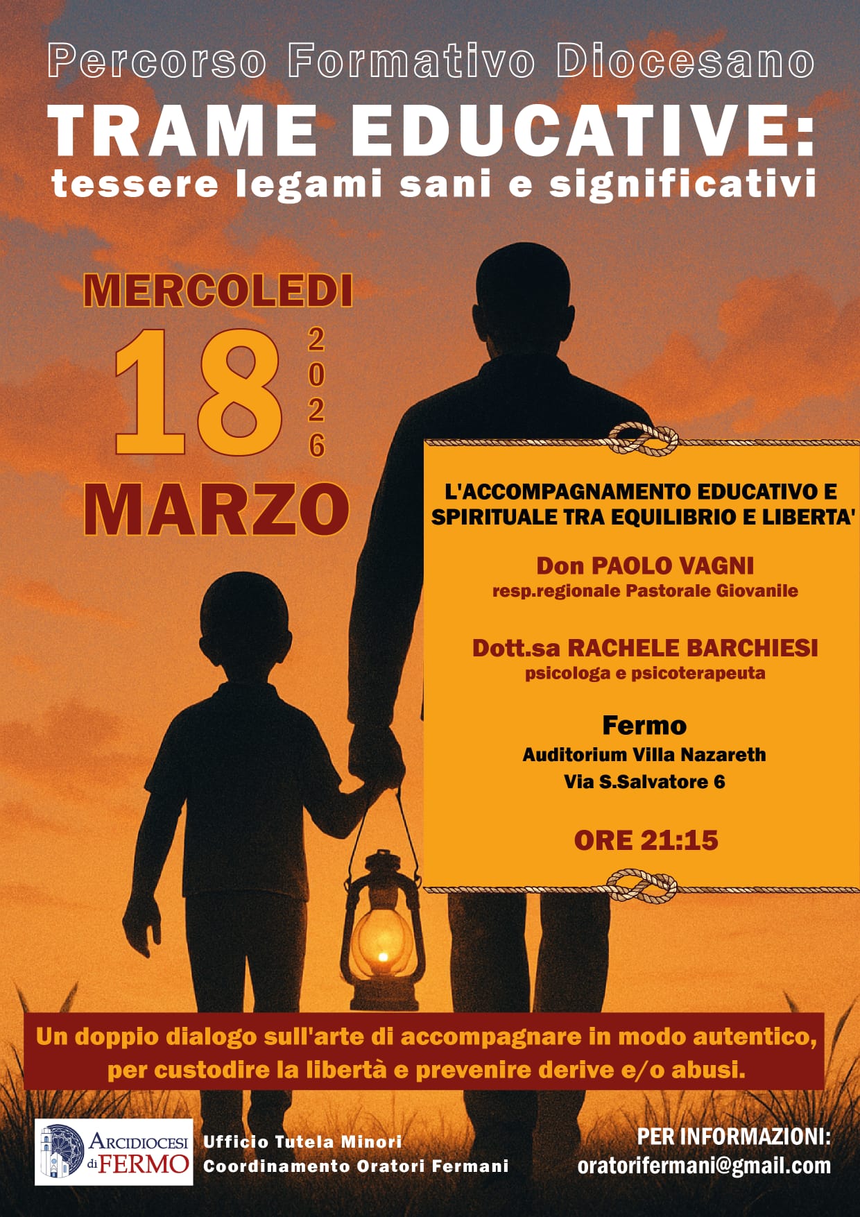 Lo spazio dedicato alla formazione quest’anno si dilata, accompagnandoci durante tutto l’anno pastorale 2025-2026. Un percorso formativo promosso dal Coordinamento Oratori Fermani in collaborazione con l’Ufficio Tutela Minori dell’Arcidiocesi di Fermo sull’importante tema della Relazione Educativa. Tessere legami sani e significativi è il nostro impegno quotidiano, soprattutto nell’attenzione alla tutela dei minori. Da qui la necessità di sostenere quanti con passione e sacrifico svolgono il ruolo di formatori a vario titolo nel mondo giovanile.